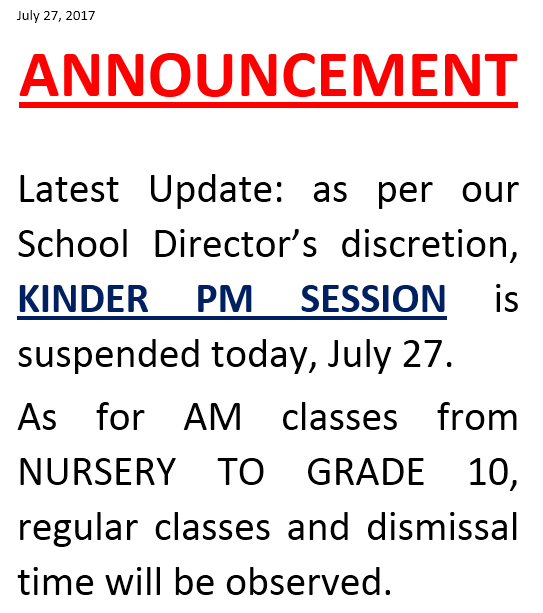 Home > Advisories > JULY 27: CANCELLATION OF CLASSES