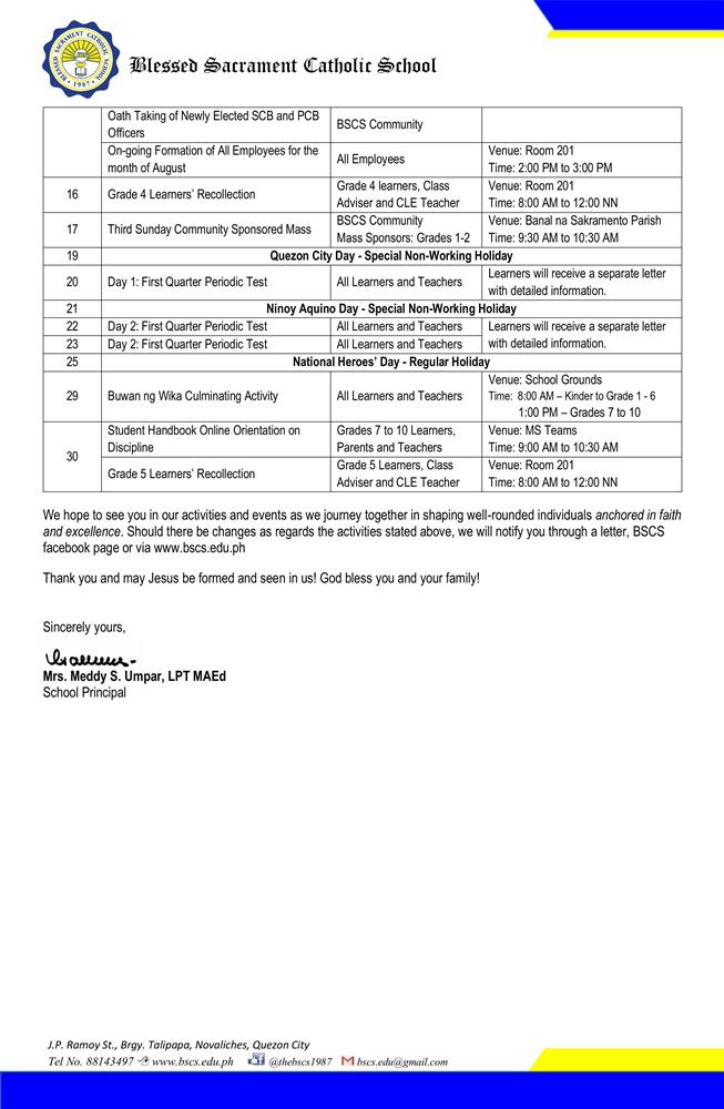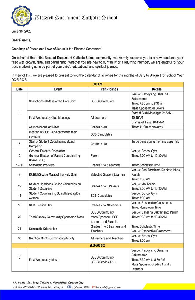 Home > Advisories > Calendar of Activities for the Month of July and August