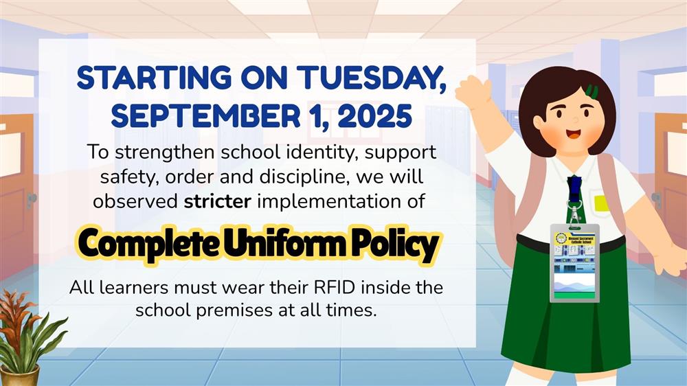 All Sacramentians are expected to come to school wearing their complete daily uniform starting September 1, 2025. Please make sure to follow the prescribed dress code at all times.