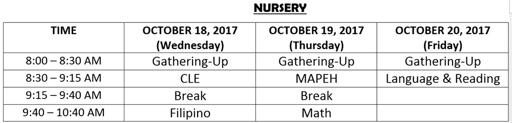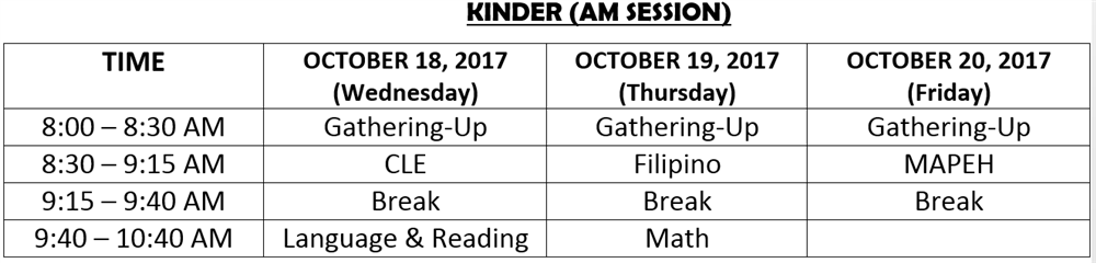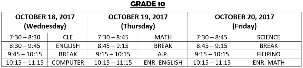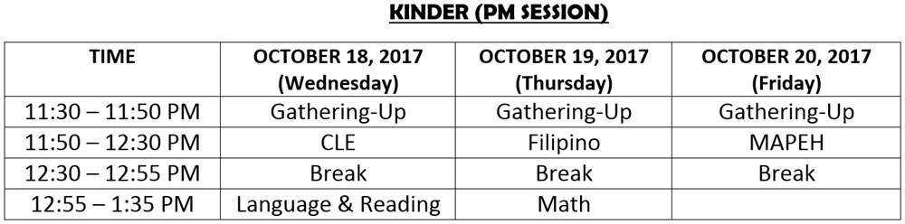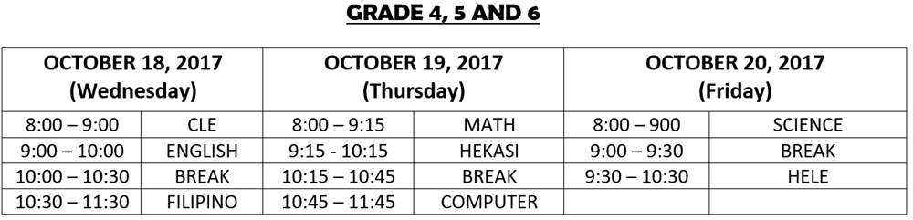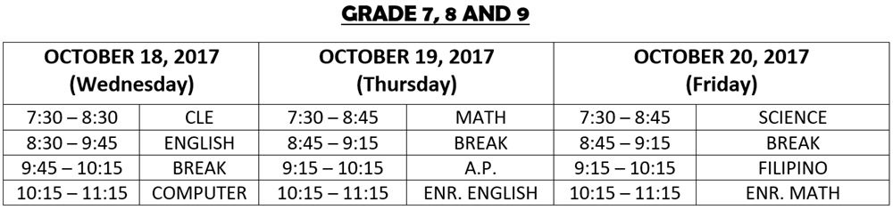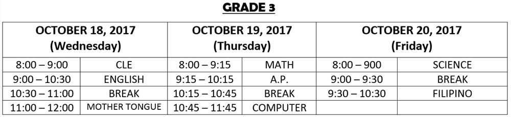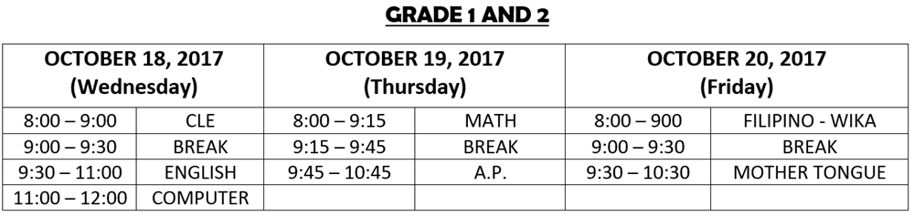In case of a NO CLASS declaration by the Department of Education (DepEd) or the Local Government Unit (LGU), the tests scheduled on the day when classes are cancelled shall be administered on the last day. The schedule of tests for the succeeding day will thus be observed.