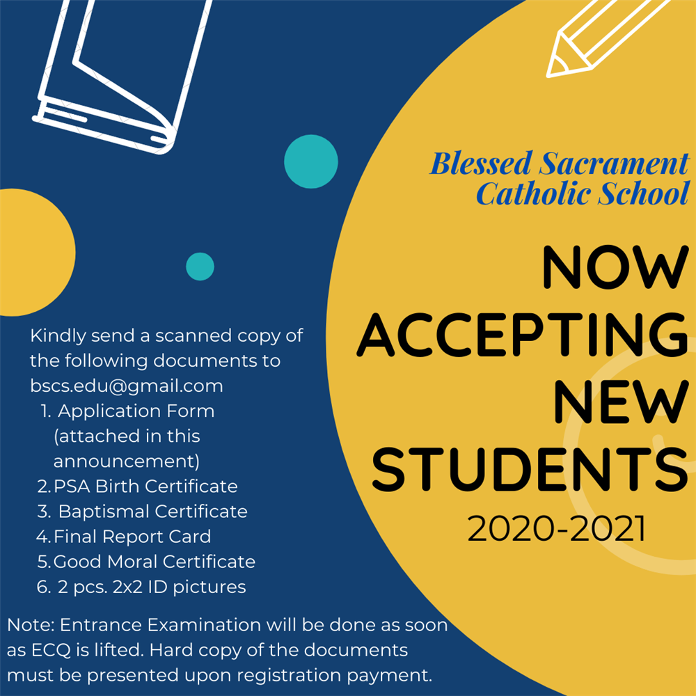 The Blessed Sacrament Catholic School is now accepting NEW ENROLLEES for S.Y. 2020-2021. Kindly send a scanned copy of the following documents to